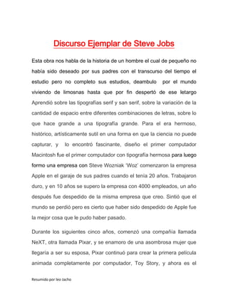 Steve Jobs tuvo una infancia difícil pero aprendió sobre diseño tipográfico, diseñó el primer Macintosh y fundó Apple en un garaje a los 20 años. Aunque fue despedido de Apple cinco años después, fundó otras empresas exitosas como NeXT y Pixar. Más tarde regresó a Apple y la convirtió en la empresa de tecnología más valiosa del mundo. El relato también enseña que nunca se debe rendir ante los desafíos de la vida y que con determinación todo es posible, excepto superar la muerte.