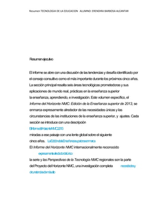 Este documento resume un informe sobre tecnologías emergentes en la educación superior. Describe seis tecnologías divididas en tres horizontes de adopción (corto, medio y largo plazo). En el corto plazo, los MOOCs y las tablets se espera que se adopten ampliamente. En el mediano plazo, los juegos educativos y el análisis de aprendizaje ganarán importancia. A largo plazo, se espera que la realidad aumentada, los espacios de aprendizaje híbrido y los