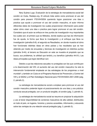 El documento analiza la estrategia de mercadotecnia social para promover el uso del condón masculino en Cuba. Describe que las relaciones sexuales sin protección contribuyen a la propagación del VIH. La estrategia busca posicionar la conducta sexual protegida mediante la disponibilidad y accesibilidad de condones de alta calidad. La metodología incluyó encuestas transversales para evaluar los conocimientos, actitudes y uso autonotificado de condones entre la población cubana. El autor concluye que la estrategia requiere ser adaptada