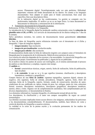 El documento describe la documentación fotográfica en la prensa escrita. Explica que las fotografías se han vuelto una parte integral de los contenidos informativos de los periódicos desde finales del siglo XIX. También describe los diferentes tipos de fotografía periodística, el proceso de gestión de fotografías, y el papel de los centros de documentación de prensa y los documentalistas en la indización, almacenamiento y recuperación de fotografías para su uso interno y externo.