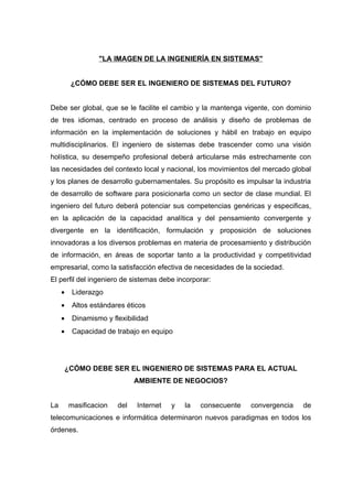 El documento presenta un resumen del perfil del ingeniero de sistemas en el futuro. Debe ser global y centrado en el análisis y diseño de soluciones tecnológicas. También debe tener liderazgo, estándares éticos altos, ser dinámico y flexible, y capaz de trabajar en equipo. El ingeniero de sistemas debe adaptarse a los cambios en el ambiente empresarial como la convergencia de telecomunicaciones e informática.