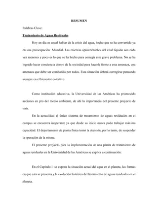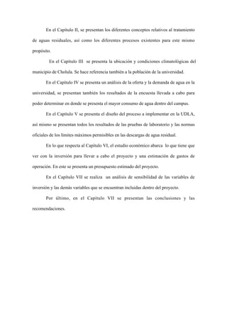 El documento habla sobre la importancia de implementar un sistema de tratamiento de aguas residuales en la Universidad de las Américas debido a que el sistema actual se encuentra inoperante. Explica que el proyecto consiste en 7 capítulos que cubren temas como la situación actual del agua, los procesos de tratamiento, un análisis de la oferta y demanda de agua en la universidad, el diseño propuesto y su análisis económico y de sensibilidad. El objetivo final es presentar las conclusiones y recomendaciones sobre la mejor op