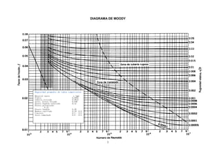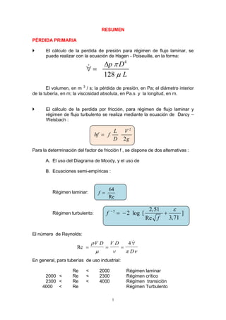 Este documento describe los métodos para calcular las pérdidas de presión en tuberías debido a la fricción y accesorios. Explica las ecuaciones de Hagen-Poiseuille, Darcy-Weisbach y Colebrook para calcular la pérdida primaria en régimen laminar y turbulento. También presenta expresiones analíticas, coeficientes experimentales y la longitud equivalente para evaluar las pérdidas secundarias en codos, válvulas y otros accesorios. Por último, detalla el cálculo total de la pérdida