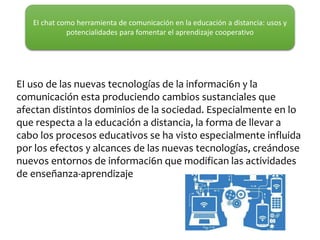 Este documento describe el potencial del chat como herramienta de comunicación sincrónica para fomentar el aprendizaje cooperativo a distancia. Explica que el chat permite la interacción en tiempo real entre estudiantes y que estudios han demostrado que esto facilita el trabajo en grupo y la comprensión del material. También señala que el chat puede usarse para discutir tareas y proyectos grupales, y para crear comunidades virtuales de aprendizaje.