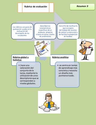 Las rúbricas son guías de puntuación utilizadas para evaluar el desempeño de los estudiantes, describiendo las características específicas de un trabajo en varios niveles de rendimiento para clarificar las expectativas y facilitar la retroalimentación. Existen dos tipos de rúbricas: globales, que evalúan el trabajo de forma holística; y analíticas, que se enfocan en tareas más específicas.