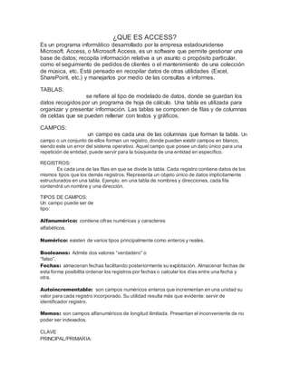 Access es un programa de Microsoft que permite gestionar bases de datos recopilando información de diferentes fuentes en tablas, campos y registros. Las tablas organizan la información en filas y columnas, los campos son cada una de las columnas, y los registros son las filas, donde cada uno contiene datos de un objeto único. Los campos pueden ser de diferentes tipos como alfanumérico, numérico o fecha. La clave primaria identifica de forma única cada registro a través de un campo o combinación de campos.