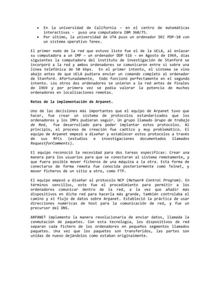 ARPANET fue creada por el Departamento de Defensa de EE.UU. en la década de 1960 para permitir el intercambio de información entre universidades e instituciones de investigación en caso de un ataque nuclear. Consistía inicialmente en 4 nodos conectados y usaba tecnología de conmutación de paquetes para enviar datos de forma eficiente. Estableció los protocolos fundamentales como Telnet, FTP y el correo electrónico y sirvió como precursor de Internet al conectar diversas redes hasta su retiro en 1990.