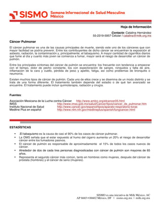 El documento proporciona información sobre el cáncer de pulmón. Explica que el tabaquismo es la principal causa del cáncer de pulmón y que entre más cigarrillos se fumen diariamente y más joven se empiece a fumar, mayor es el riesgo de desarrollar este cáncer. También describe los principales síntomas y tipos de tratamiento para el cáncer de pulmón. Por último, presenta estadísticas clave como que el tabaquismo causa casi el 90% de los casos y que representa el segundo cáncer
