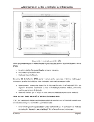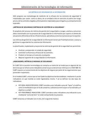 Este documento discute los conceptos de métricas, medidas e indicadores de seguridad de la información. Explica que las métricas miden la efectividad de los controles de seguridad implementados, mientras que las medidas evalúan la eficacia del sistema de gestión de seguridad en su conjunto. También cubre temas como los tipos de medidas, el proceso de desarrollo de medidas, y cómo generar indicadores a partir de las medidas recopiladas.