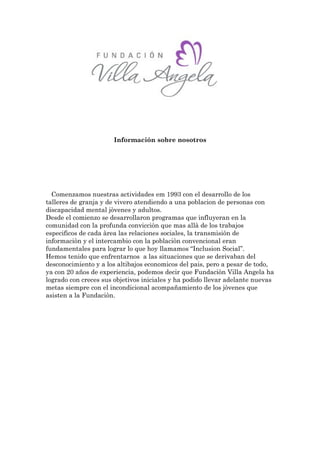Este documento presenta la misión y servicios de una fundación que brinda apoyo a personas con discapacidad. Su misión es trabajar con y para personas con discapacidad mental jóvenes y adultas para desarrollar sus potencialidades y lograr su inclusión social. Ofrece servicios como un centro de día, programas culturales, de prevención del maltrato y estimulación a través de la interacción con animales. Su objetivo final es mejorar la calidad de vida de las personas con discapacidad y generar conciencia en la comunidad.