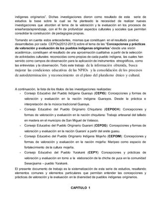 Este documento presenta una investigación sobre las concepciones y prácticas de valoración del aprendizaje en las naciones y pueblos indígenas originarios de Bolivia. Se realizaron estudios cualitativos en cinco pueblos indígenas analizando sus prácticas culturales como música, artesanía, baile y otros. El objetivo es construir un modelo de evaluación educativa basado en la valoración comunitaria y cultural de cada pueblo para mejorar la educación intercultural en Bolivia.