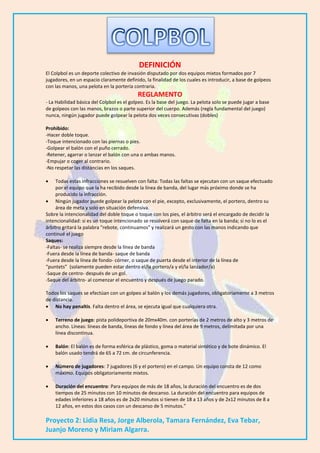 El Colpbol es un deporte de equipo mixto disputado por dos equipos de 7 jugadores cuyo objetivo es introducir una pelota en la portería contraria mediante golpeos con las manos. Se juega en una pista de 20x40m con porterías de 2x3m. No se permite doble toque, tocar el balón con los pies salvo el portero en su área, agarrar el balón, empujar a otros jugadores. Las faltas se resuelven con saque. El partido consta de dos tiempos de entre 12 y 25