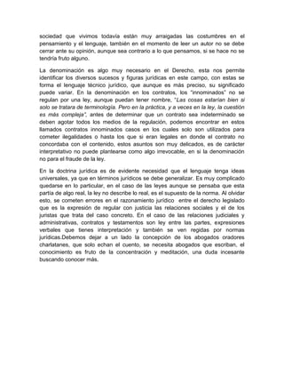 El documento discute la importancia del lenguaje preciso y claro en el derecho y la sociedad. Explica que el lenguaje es fundamental para pensar, analizar y comprender la realidad, y que términos mal utilizados o frases hechas pueden causar problemas de interpretación, especialmente en el derecho. También señala que la denominación de conceptos jurídicos es necesaria para identificar sucesos y figuras legales, pero que los significados pueden variar, por lo que se debe prestar atención al contexto.