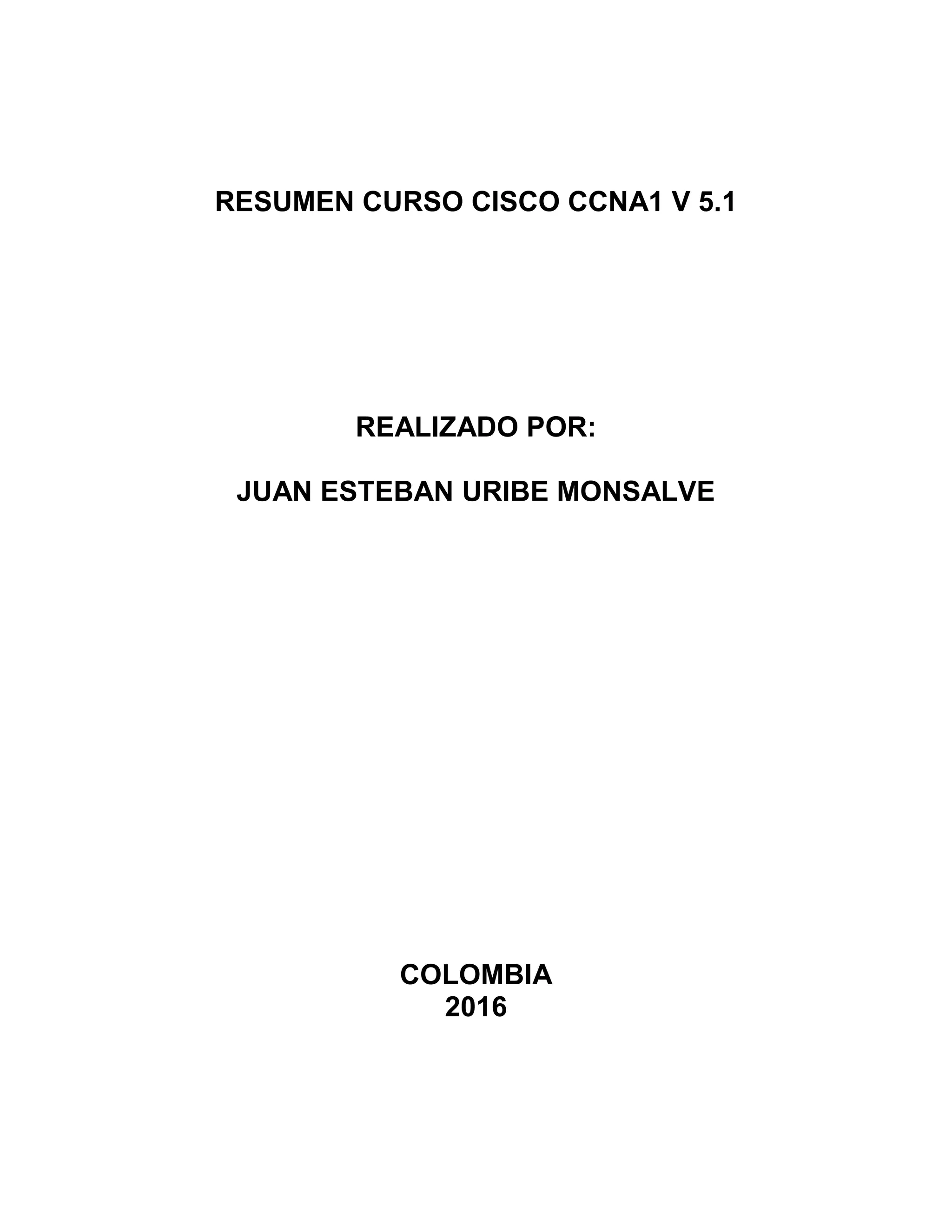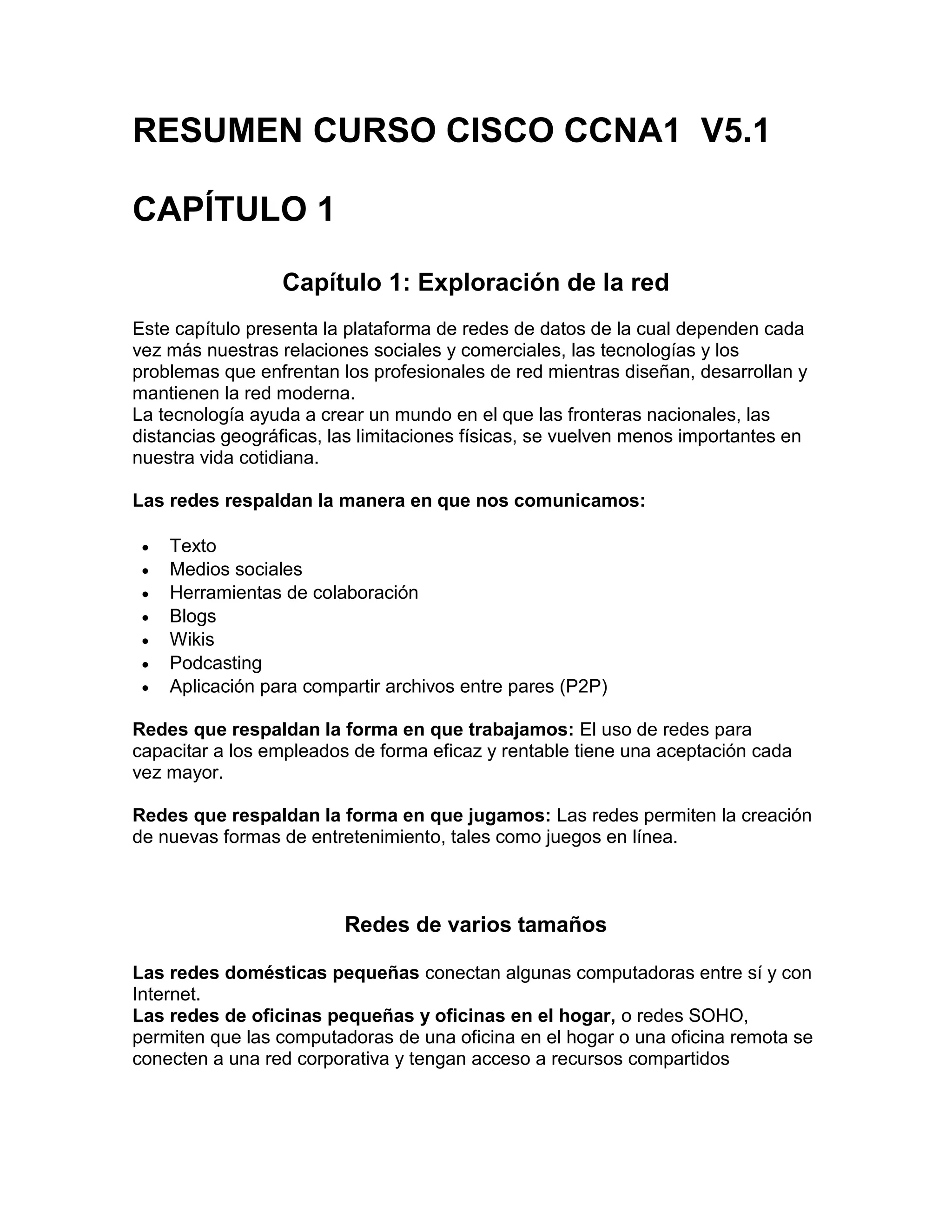 Este documento resume el Capítulo 1 del curso Cisco CCNA1 v5.1. Explica los conceptos básicos de las redes, incluyendo los tipos de redes, componentes, topologías, servicios y tecnologías. También cubre amenazas a la seguridad y soluciones. El Capítulo 2 discute los sistemas operativos de red y sus componentes.