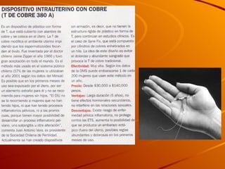 El documento aborda la diversidad de métodos anticonceptivos, clasificándolos en no hormonales, hormonales, permanentes y naturales. Además, enfatiza la importancia de elegir el método adecuado según la relación de pareja y las características personales. La responsabilidad de cuidarse en el ámbito de la sexualidad se destaca como un aspecto esencial.