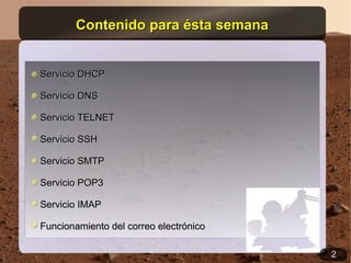 Este documento describe varios protocolos de red comúnmente usados como DHCP, DNS, SMTP y POP3. Explica que DHCP permite a las computadoras asignar automáticamente parámetros de configuración de red como direcciones IP. También describe cómo DNS traduce nombres de dominio a direcciones IP y viceversa usando un sistema jerárquico de servidores. Además, detalla cómo protocolos como SMTP y POP3 permiten el funcionamiento del correo electrónico.