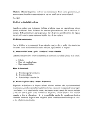El edema es la inflamación de una parte del cuerpo debido a la acumulación de líquido en los tejidos. Puede ser causado por obstrucción venosa o linfática, insuficiencia cardiaca o renal, estados que disminuyen la albúmina sérica, cirrosis o medicamentos. Existen dos tipos principales de edema: intracelular causado por falta de nutrición celular, y extracelular causado por retención de líquidos en los espacios extracelulares. Algunas causas comunes de edema localizado son la obstrucción linfática