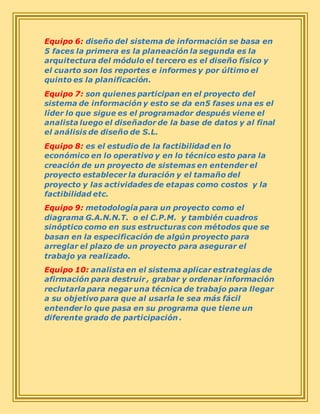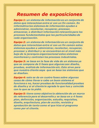 Los equipos presentaron diferentes definiciones y enfoques sobre los sistemas de información. Varios equipos describieron los sistemas de información como conjuntos de datos que interactúan para un propósito común, mientras que otros se enfocaron en las fases del desarrollo de sistemas o en los roles de las personas involucradas. Algunos equipos también discutieron temas como la factibilidad, las metodologías de proyectos y las estrategias de análisis.