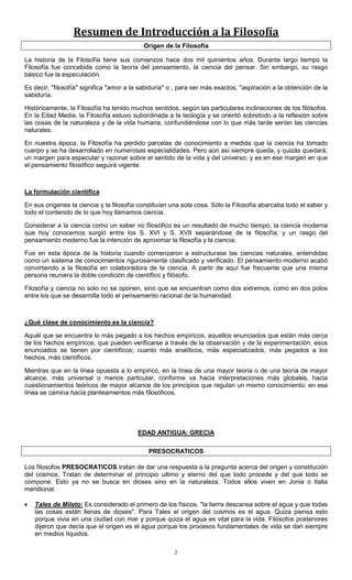 1) El documento resume la historia de la filosofía desde sus orígenes en la antigua Grecia hasta la época moderna, destacando las principales corrientes de pensamiento y filósofos. 2) Los presocráticos trataron de explicar el origen del cosmos y propusieron principios como el agua, el aire o el fuego, mientras que los sofistas se centraron en el hombre y la sociedad y Sócrates enfatizó la importancia de conocernos a nosotros mismos. 3) La ciencia moderna surgió separ