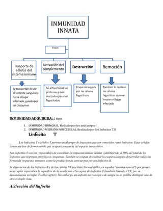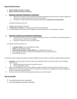 Los órganos linfoides primarios, como el timo y la médula ósea, maduran los linfocitos dotándolos de receptores específicos para antígenos y seleccionándolos para evitar la autoinmunidad. Los órganos linfoides secundarios, como los ganglios linfáticos y el bazo, permiten la interacción de linfocitos con antígenos y diseminan la respuesta inmune por el cuerpo. Los linfocitos T maduros emigran a los órganos secundarios donde coordinan la