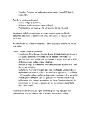 El documento resume la historia de Europa durante la Edad Media, incluyendo el sistema feudal, la estructura social jerárquica, el papel de la iglesia y los monasterios, y las características artísticas del estilo románico. Se divide la Edad Media en Alta y Baja, y explica conceptos como el feudalismo, los diferentes estamentos sociales, y las características arquitectónicas e iconográficas del arte románico.