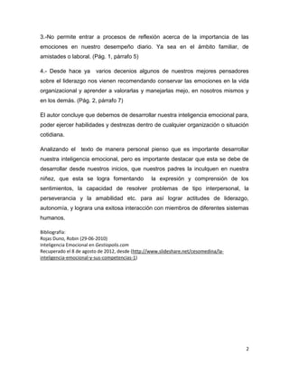 El documento habla sobre la inteligencia emocional y cómo puede ayudar o causar más problemas en situaciones críticas. Se divide en cuatro partes: la introducción del tema, el concepto de inteligencia emocional, cómo la crianza afecta la vida y cómo afecta las organizaciones. Concluye que debemos desarrollar nuestra inteligencia emocional para ejercer habilidades en cualquier situación a través del desarrollo desde la niñez de la comprensión de sentimientos y resolución de problemas.