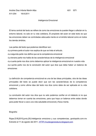 El documento habla sobre la inteligencia emocional y cómo las emociones afectan el entorno laboral y la vida cotidiana. Explica que las emociones deben controlarse adecuadamente tanto en el trabajo como en otros ámbitos. También define la competencia emocional, sus características y cómo aplicarla para lograr un balance entre las emociones y llevar una vida saludable.