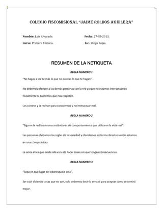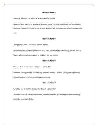 Este documento presenta 10 reglas de la netiqueta. La primera regla indica que no debemos ofender a otros en internet como no queremos ser ofendidos. La segunda regla establece que debemos comportarnos en internet como en la vida real. La tercera regla señala la importancia de estar conscientes del contexto en el que nos encontramos en internet.
