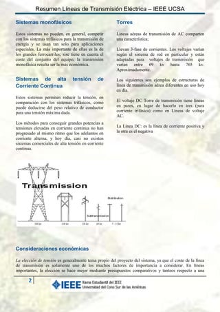 Este documento describe los principales componentes y conceptos relacionados con las líneas de transmisión eléctrica. Explica que la energía generada se transporta a través de líneas de transmisión a altos niveles de voltaje, luego se reduce a niveles más bajos para su distribución a los usuarios finales. También cubre temas como los diferentes tipos de sistemas de transmisión, consideraciones económicas para la selección de voltaje y conductor, y los diversos tipos de torres y estructuras utilizadas para soport