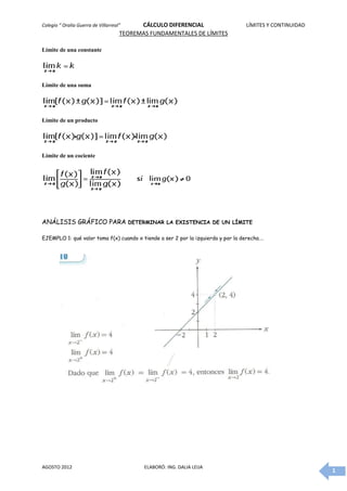 El documento presenta los conceptos básicos de límites y continuidad en cálculo diferencial, incluyendo definiciones de límites de funciones constantes, sumas, productos y cocientes, así como análisis gráfico de límites y ejemplos numéricos. También explica límites infinitos y límites en el infinito, ilustrando cómo determinar estos valores a través de gráficas. Finalmente, propone ejercicios prácticos para que los estudiantes apliquen los conocimientos.
