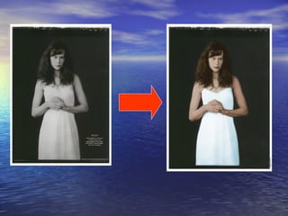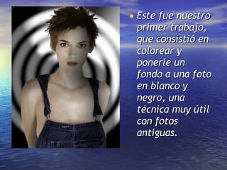 Este documento presenta varios ejemplos de trabajos realizados en Photoshop, incluyendo colorear fotos en blanco y negro, modificar secciones de color en imágenes, eliminar partes de fotos y reemplazarlas con otras, introducir nuevas imágenes en fotos ya editadas, extraer selecciones complejas, crear fondos personalizados, eliminar imperfecciones de la piel, combinar imágenes mediante degradados y máscaras rápidas, agregar texto, y aplicar maquillaje digitalmente usando pinceles.