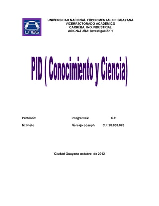 El documento presenta diferentes definiciones de conocimiento y ciencia. Define el conocimiento como información adquirida a través de la experiencia o educación y clasifica diferentes tipos de conocimiento como científico, artístico y revelado. También describe el conocimiento cotidiano y vulgar. Explica que la ciencia es un conjunto de conocimientos sistemáticos y presenta diferentes clasificaciones y métodos científicos como el empírico-analítico y experimental.