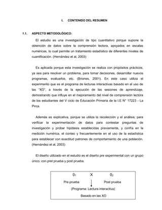 La investigación evalúa un programa de lecturas interactivas utilizando laptops XO para mejorar la comprensión lectora en estudiantes de educación primaria en la IE N° 17223 - La Pirca. Se aplica un diseño preexperimental con pre y post pruebas, evidenciando que el programa incrementó significativamente los niveles de comprensión literal, inferencial y crítica. Los resultados reflejan un avance notable en comparación con las mediciones previas a la intervención.