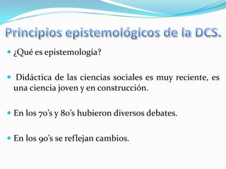 El documento discute las teorías y enfoques de la didáctica de las ciencias sociales, incluyendo las teorías constructivistas de Piaget y Bruner, la taxonomía de Bloom, el enfoque significativo de Ausubel, y las contribuciones de Vigotski. También describe las visiones positivista, humanista, crítica y postmodernista de la ciencia, así como las finalidades de enseñar las ciencias sociales para promover la democracia y valores como el respeto, la participación y la apreciación de la diversidad.