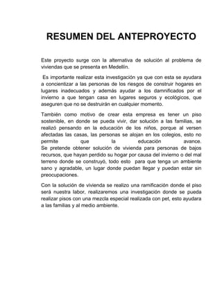 Este documento propone un proyecto para solucionar el problema de vivienda en Medellín, brindando hogares seguros y ecológicos a personas de bajos recursos que han perdido sus casas debido a desastres naturales o por haberse construido en terrenos inadecuados. El proyecto busca también mejorar la educación y el medio ambiente mediante la construcción de viviendas sostenibles con pisos especiales de pet.