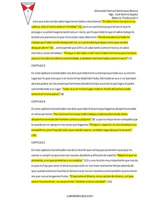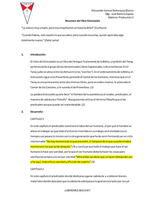 El documento resume el libro del Eclesiastés de la Biblia en 3 oraciones: 1) El libro cuestiona el esfuerzo humano y concluye que todo trabajo es vanidad; 2) Aunque la sabiduría es mejor que la ignorancia, al final tanto sabios como necios morirán y serán olvidados; 3) El libro enseña que la vida es pasajera y que al morir el espíritu vuelve a Dios, por lo que debemos temerle y cumplir sus mandamientos.