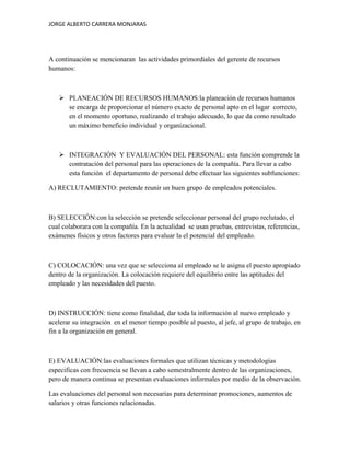 Las principales funciones de la gerencia del capital humano incluyen asesoría y consultoría, servicios como reclutamiento y capacitación, formulación e implementación de políticas, y representación de los trabajadores. Las actividades primordiales son la planeación de recursos humanos, integración y evaluación del personal, capacitación y desarrollo, administración de sueldos y salarios, y relaciones laborales. Para ser competente, la gerencia del capital humano debe dominar el negocio, los recursos humanos, el cambio, y tener credibilidad personal.