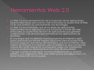 La Web 2.0 representa la evolución de aplicaciones tradicionales a aplicaciones enfocadas en el usuario final que fomentan la colaboración. Google Docs, Calendar, Gmail y otras herramientas permiten la creación y edición colaborativa de documentos en línea. RSS es un formato que facilita la distribución y acceso a contenidos de sitios web en lectores o páginas web.