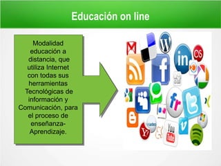 Este documento describe las ventajas y desventajas del aprendizaje en línea (e-learning) y el uso de las tecnologías de la información y la comunicación (TIC) en la educación. Algunas ventajas clave son la personalización del aprendizaje, la flexibilidad, y el acceso fácil a la información. Sin embargo, también existen riesgos como la distracción, el aislamiento y aprendizajes incompletos. El documento también analiza cómo las TIC eliminan barreras espacio-temporales y favorecen el aprend