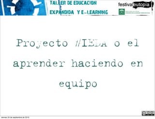 Este documento resume un taller sobre educación expandida y e-learning. El taller discute temas como la relación entre los estudiantes de la "generación digital" y la tecnología, las rutinas docentes tradicionales, y cómo situar la enseñanza en el contexto actual. Propone aprender de forma colaborativa y a través de proyectos prácticos en lugar de exámenes.