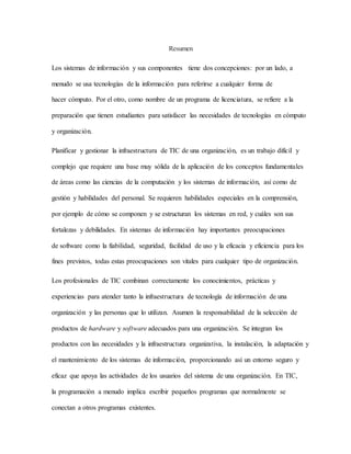Este documento discute dos concepciones de sistemas de información y tecnologías de la información. También describe los roles y responsabilidades de los profesionales de TIC en el contexto organizacional. Finalmente, analiza el impacto de las TIC en la educación y la sociedad, incluido su potencial para mejorar el acceso a la información y la cultura.