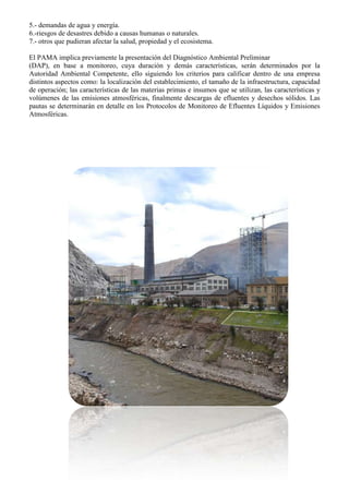 El documento describe el Estudio de Impacto Ambiental (EIA), un procedimiento administrativo que identifica los impactos ambientales de un proyecto y permite a las autoridades aceptarlo, rechazarlo o modificarlo. También describe el Programa de Adecuación y Manejo Ambiental (PAMA), el cual contiene acciones para reducir sustancias contaminantes y cumplir con estándares ambientales, incluyendo un Diagnóstico Ambiental Preliminar para evaluar aspectos como emisiones y efluentes de una empresa.