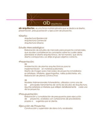 ab arquitectos es una firma multidisciplinaria especializada en el diseño, presentación, presupuestación y ejecución de proyectos arquitectónicos. Ofrecen servicios que incluyen diseño arquitectónico, estudios de mercado para proyectos comerciales, presentación de planos en formatos publicitarios, y gestión de presupuestos y supervisión de obras. Su enfoque combina la arquitectura residencial, comercial y urbana con herramientas de diseño tridimensional y marketing inmobiliario.