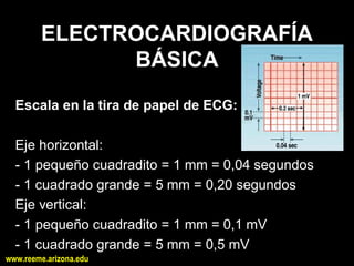 Este documento presenta una guía básica para la lectura de electrocardiogramas (ECG). Explica la escala de tiempo y voltaje en la tira de papel de ECG y destaca los parámetros a considerar como ritmo, frecuencia, ondas, intervalos y eje eléctrico. También describe los valores normales de estos parámetros y cómo identificar posibles isquemias, hipertrofias o bloqueos. El objetivo es proporcionar una introducción para la interpretación de ECG.