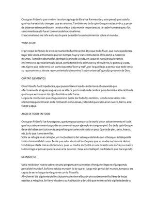 Este documento presenta un resumen de varios conceptos filosóficos griegos antiguos que aparecen en el curso de filosofía que recibe Sofía. Explica las ideas de los primeros filósofos griegos como Tales, Anaximandro y Anaxímenes, quienes se centraron en explicar la naturaleza. Luego describe las teorías de los atomistas como Demócrito, y filósofos posteriores como Sócrates, Platón y Aristóteles en Atenas.