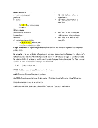 Este documento resume conceptos básicos de estructuras isostáticas, incluyendo sus componentes (columnas, vigas, cables), tipos de cargas (distribuidas, puntuales, muertas, vivas), apoyos (rodillo, fijo, empotrado, articulado), clasificaciones (macizas, reticulares, superficiales), y métodos para determinar el grado de hiperestaticidad de marcos, armaduras y vigas. También presenta fórmulas y organizaciones normativas relacionadas con el diseño y análisis estructural.