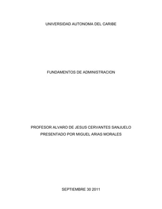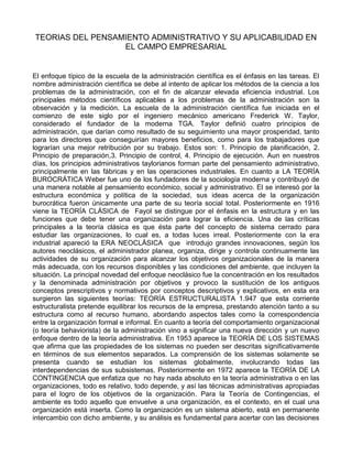 Este documento resume las principales teorías del pensamiento administrativo desde la escuela de la administración científica de Taylor hasta la teoría de la contingencia. Explica que cada teoría surgió en respuesta a los desafíos empresariales de su época y que todas son aplicables dependiendo de la situación. Concluye que la administración es una actividad fundamental para cualquier organización y que cada teoría continúa siendo relevante hoy en día para lograr la eficiencia empresarial.