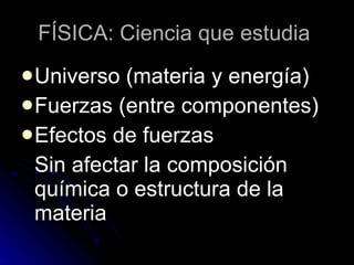 Este documento introduce los conceptos básicos de la física. Explica que la física estudia el universo, la materia, la energía y las fuerzas entre componentes sin afectar su composición química. Describe las diferentes ramas y el método científico, y define conceptos como magnitud, unidad de medida, errores de medición, estados de la materia, movimiento, fuerzas e interacciones fundamentales.
