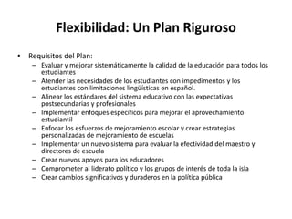 Este documento presenta el Plan de Flexibilidad ESEA del Departamento de Educación de Puerto Rico. El plan tiene como objetivos establecer expectativas postsecundarias y profesionales rigurosas para todos los estudiantes, implementar un sistema de rendición de cuentas diferenciado, y apoyar la instrucción y el liderazgo efectivo en las escuelas. El plan también busca reducir la duplicación y carga innecesaria en el sistema educativo.