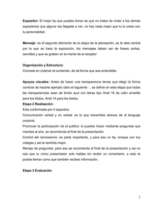 El documento presenta una guía para realizar presentaciones orales efectivas. Se divide en tres etapas: planeación, realización y evaluación. La etapa de planeación incluye analizar el tema, objetivo, audiencia y expositor. También cubre organizar el contenido y elegir apoyos visuales apropiados. La etapa de realización trata sobre comunicación verbal y no verbal, involucrar a la audiencia, controlar los nervios y manejar preguntas. La última etapa de evaluación permite mejorar presentaciones futuras identificando fortalezas y
